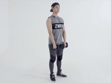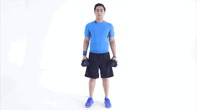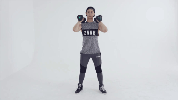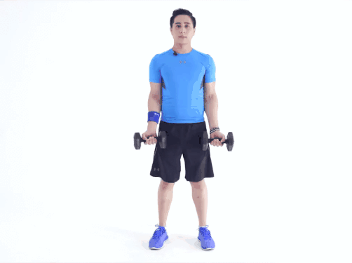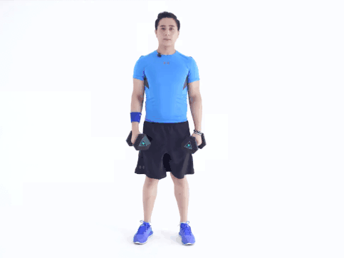 2.將啞鈴慢慢放下至與肩同高。
