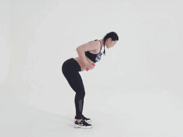 2.保持背部穩(wěn)定不動(dòng),曲肘將啞鈴提舉至腰際。