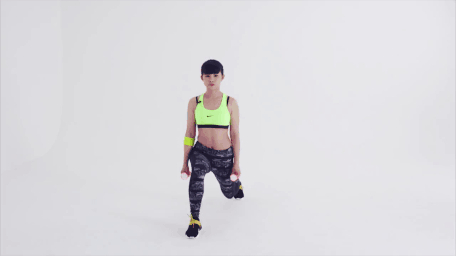 2.跨出單腳做弓箭步蹲動(dòng)作,下蹲至膝蓋呈90度,后腳膝蓋會(huì)靠近地面。